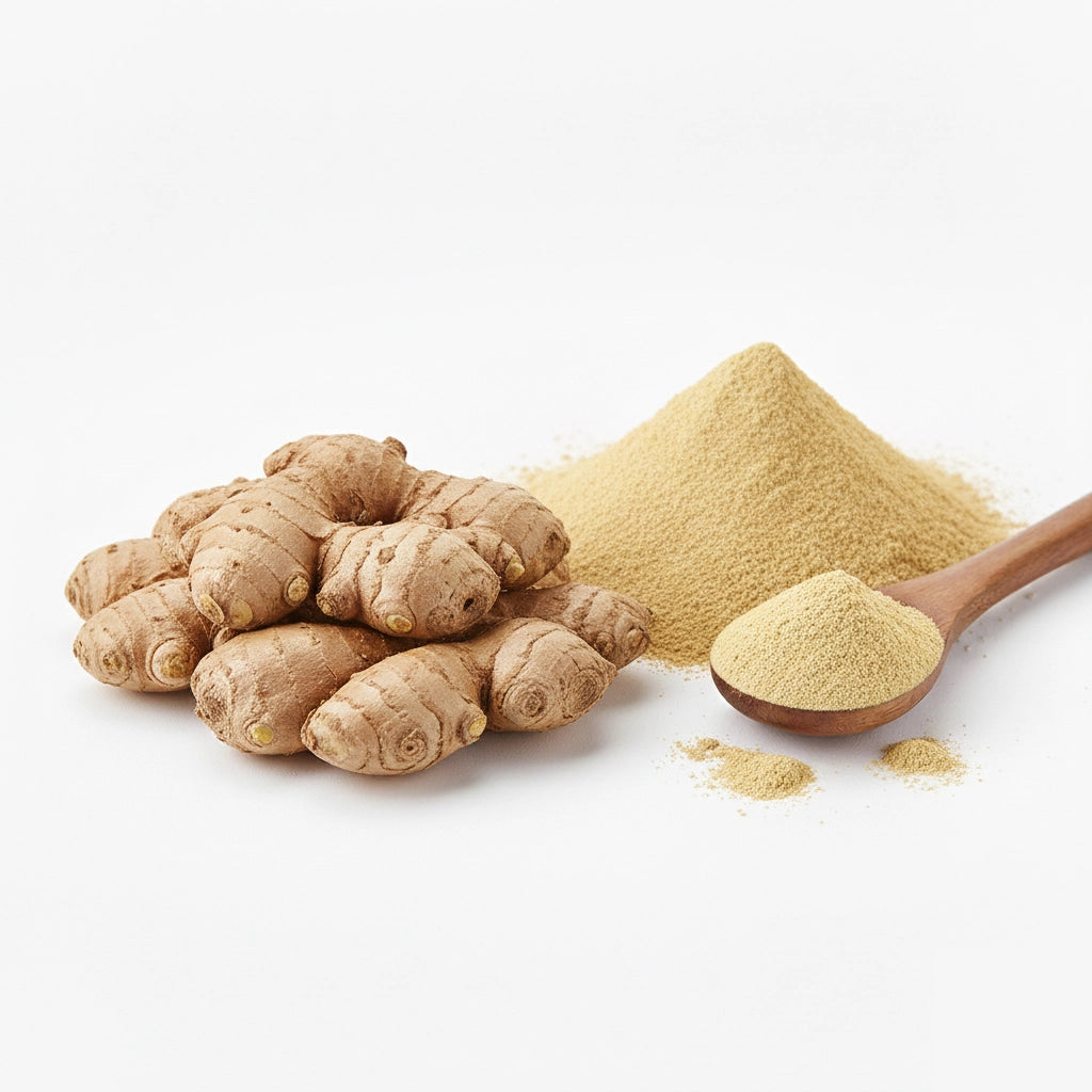 Le gingembre déshydraté en poudre Maison Myra est élaboré à partir de racines de gingembre fraîches soigneusement sélectionnées, délicatement séchées puis finement moulues afin de préserver leur arôme naturel, leur chaleur et leur saveur intense. Le processus de déshydratation concentre l’essence du gingembre tout en offrant la praticité d’une poudre prête à l’emploi.